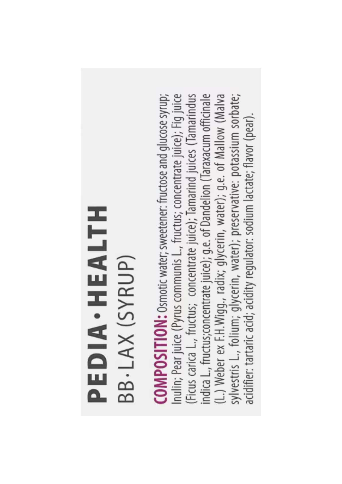 PEDIA HEALTH BB LAX is a natural syrup with Inulin, Dandelion and Mallow extracts, Pear, Fig and Tamarind juices that act synergistically and may favor the regularity of intestinal transit.