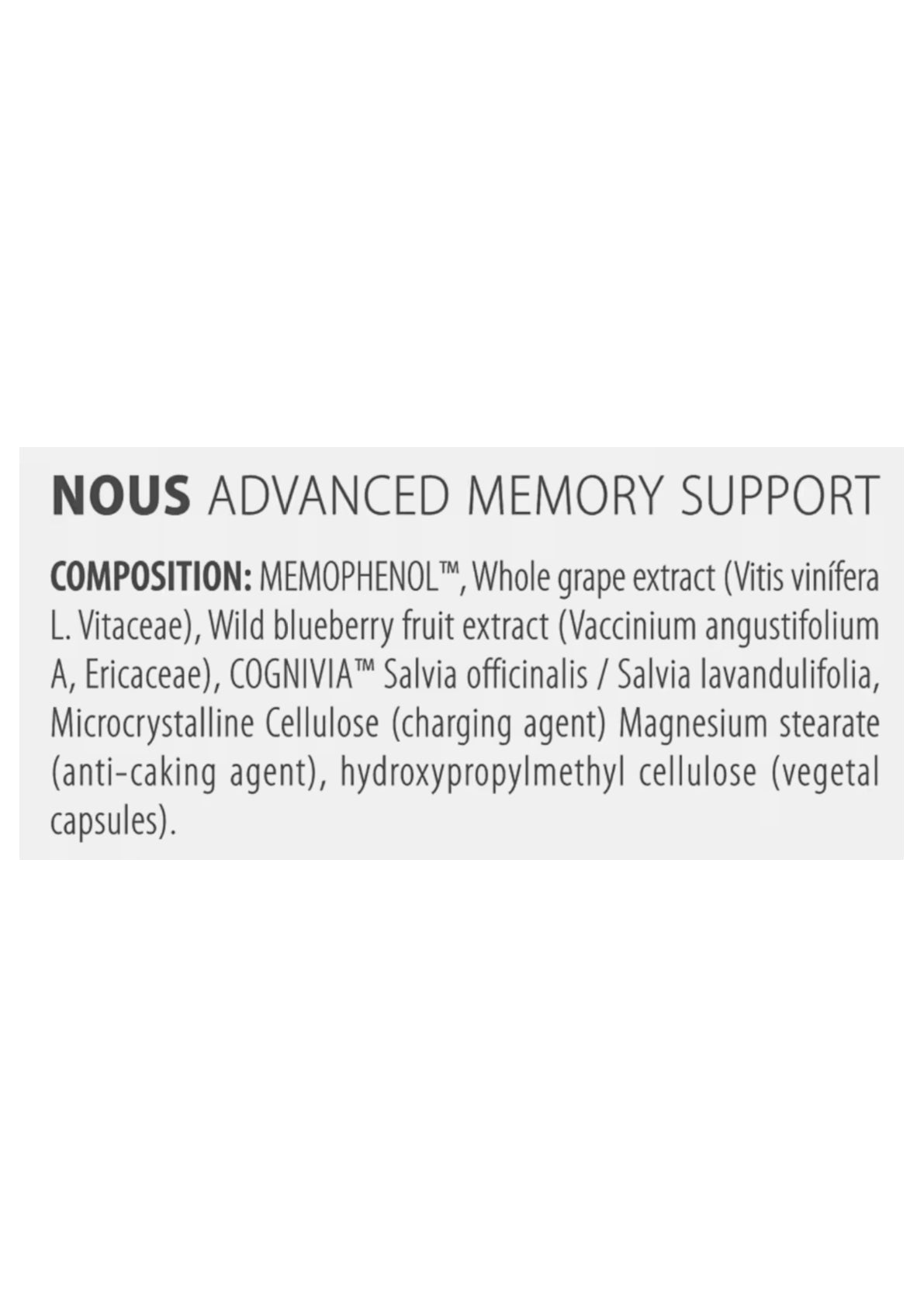 Agan Nous is a premium food supplement designed to support cognitive performance, memory, and mental clarity. It features MEMOPHENOL, a clinically researched complex of standardised grape and wild blueberry extracts, rich in natural polyphenols that help protect cells from oxidative stress and support normal brain function. The formula also includes COGNIVIA, a dual-action sage extract combining leaf essential oil and aqueous leaf extract, traditionally used to support focus, memory, and mental performance.