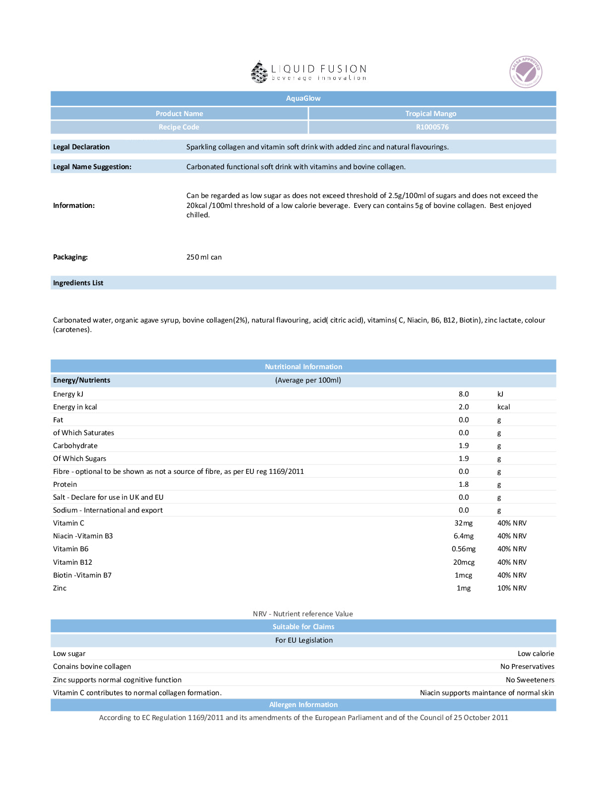 A tropical and tangy blend of ripe mangoes with a lightly sparkling finish. This drink brings the sweet, exotic flavours of the tropics right to your taste buds with a refreshing, effervescent twist. 5000mg VERISOL Collagen Peptides.
