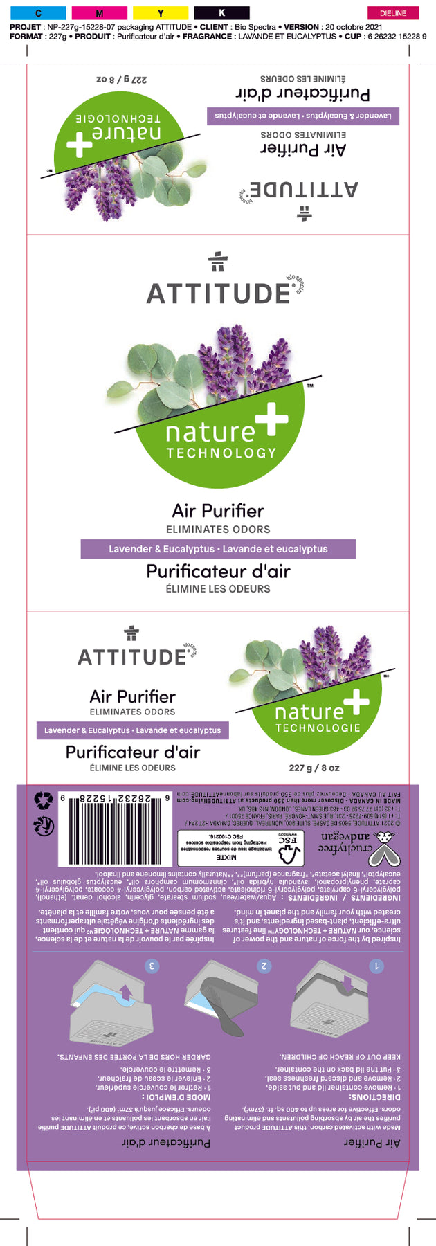 Attitude Air Purifier - Eucalyptus & Lavender essential oils. Purifies the air by absorbing pollutants and eliminating odours, does not contain artificial fragrances, phthalate or other petrochemical derivatives