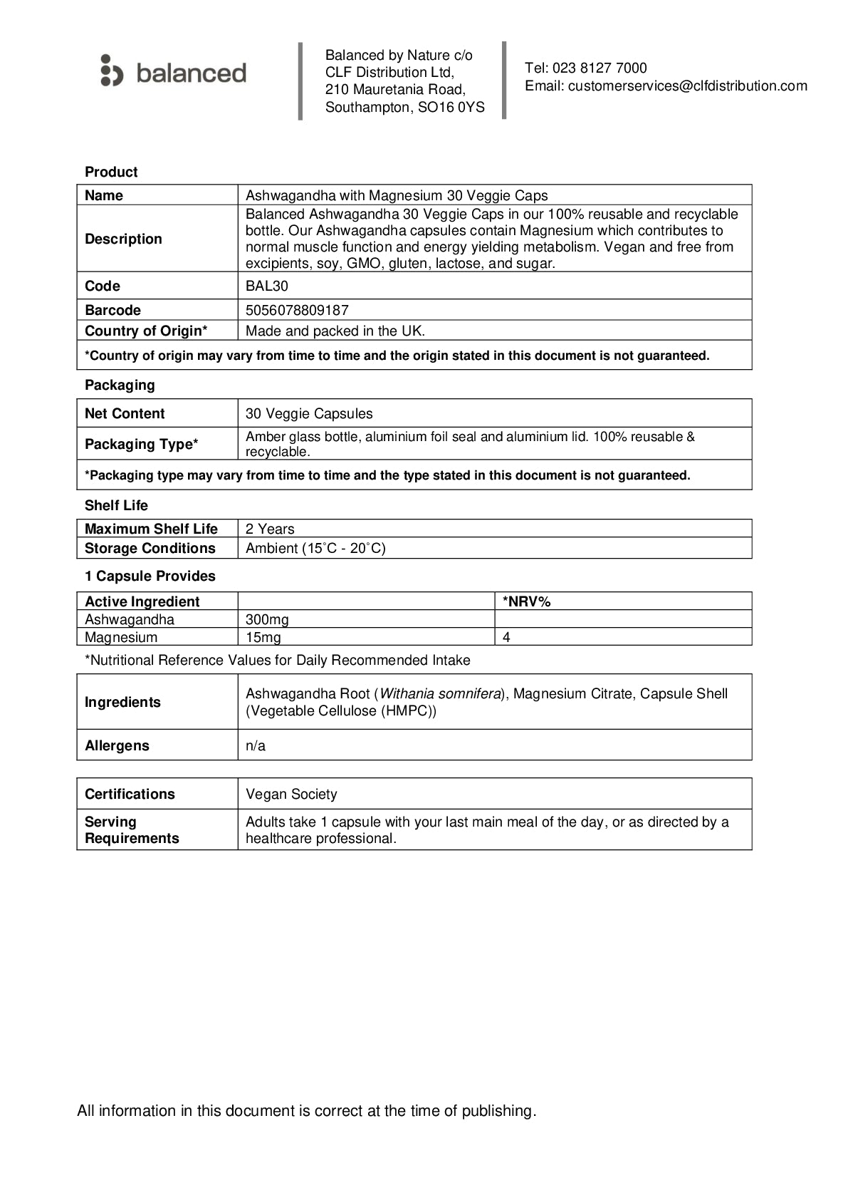 Balanced Ashwagandha 30 Veggie Caps in our 100% reusable and recyclable bottle. Our Ashwagandha capsules contain Magnesium which contributes to normal muscle function and energy yielding metabolism. Vegan and free from excipients, soy, GMO, gluten, lactose and sugar.