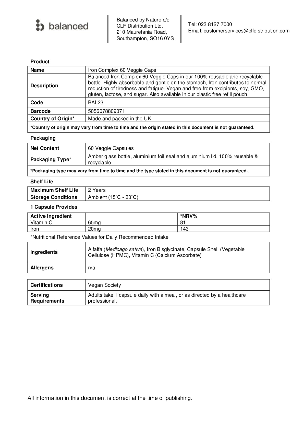 Balanced Iron Complex 60 Veggie Caps in our 100% reusable and recyclable bottle. Highly absorbable and gentle on the stomach, Iron contributes to normal reduction of tiredness and fatigue. Vegan and free from excipients, soy, GMO, gluten, lactose and sugar. Also available in our plastic free refill pouch (BAL22).