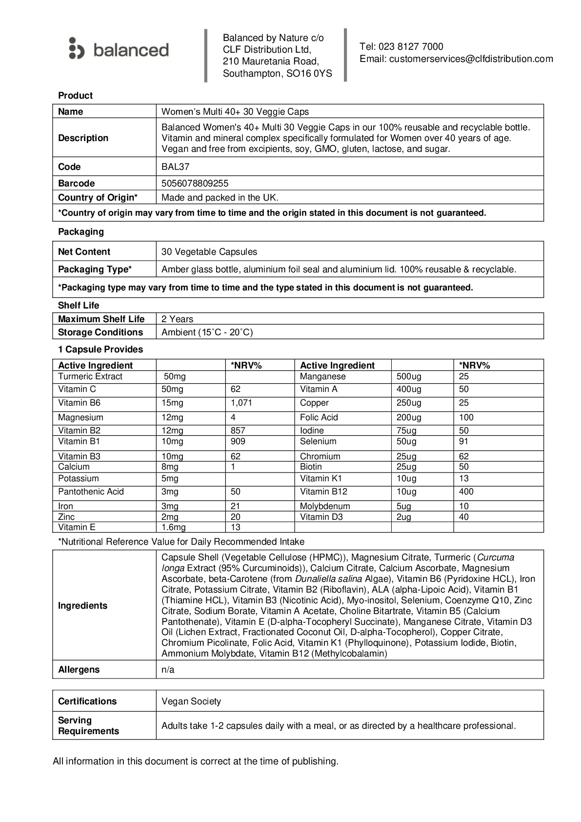 Balanced Women's 40+ Multi 30 Veggie Caps in our 100% reusable and recyclable bottle. Vitamin and mineral complex specifically formulated for Women over 40 years of age. Vegan and free from excipients, soy, GMO, gluten, lactose and sugar.