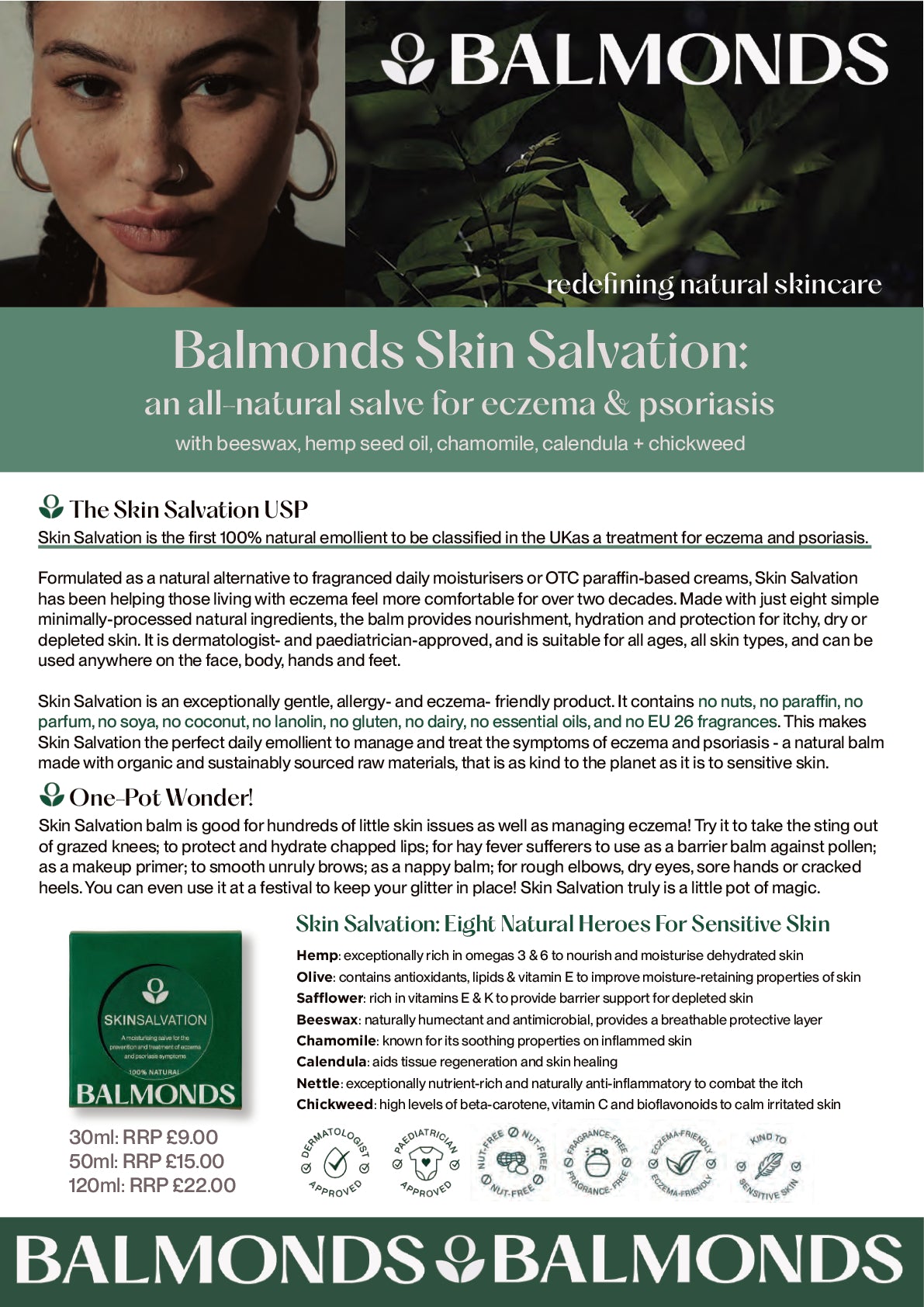 Balmonds Skin Salvation is an intensive, 100% natural balm designed to hydrate, and protect severely dry, sensitive, or eczema-prone skin. Formulated with beeswax, olive oil, and herbal extracts like chamomile and calendula, it locks in moisture whilst repairing the broken skin barrier. Free from fragrances and synthetic additives, this rich, multipurpose balm is ideal for use on any area of the body, offering moisture and support for compromised skin.