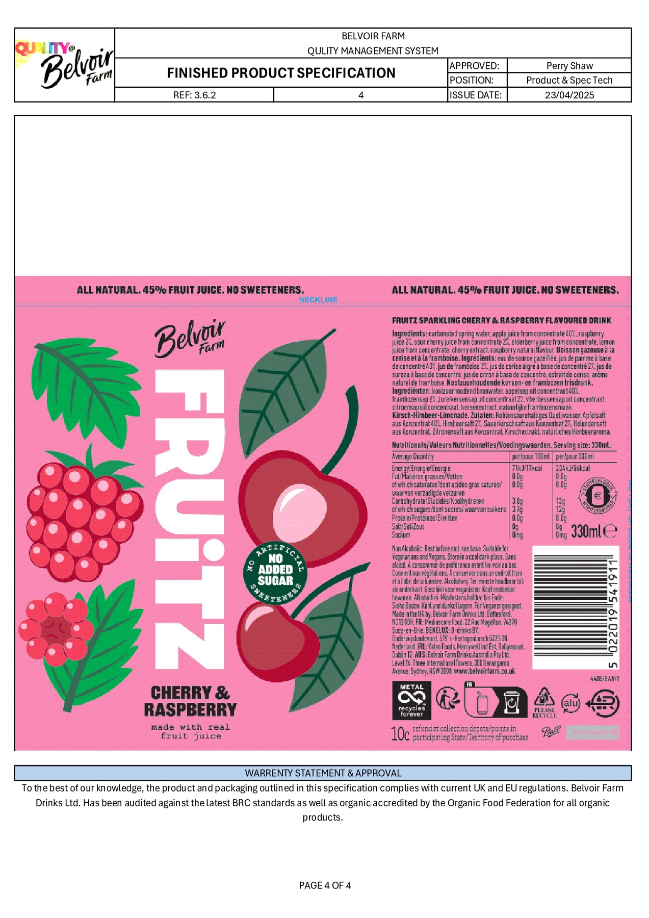 FRUiTZ Cherry & Raspberry is bursting with 45% real fruit and absolutely nothing artificial. Full of fresh fruity flavours and 100% natural. We've carefully blended a sour cherry juice with tangy raspberry and some apple juice for natural sweetness and a touch of lemon juice to help balance the flavours for a deliciously refreshing drink the whole family can enjoy.
