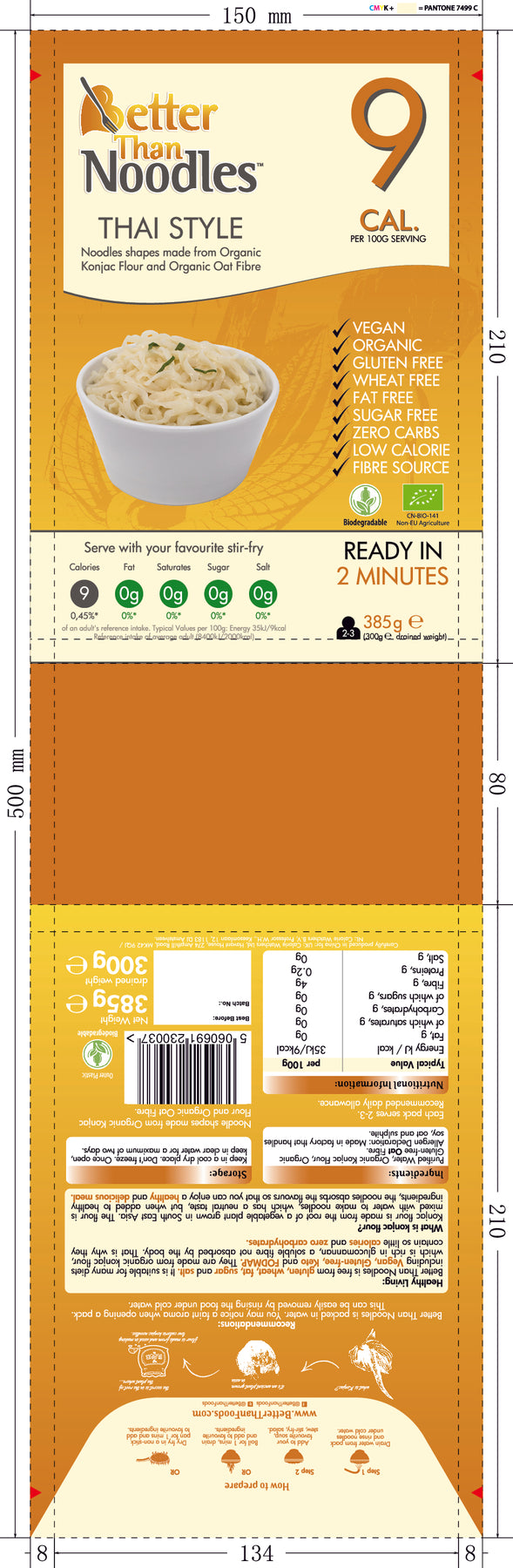 Better Than Noodles Thai Style is made from Organic Konjac flour. It is a gluten and dairy free alternative to regular flat noodles. It contains only 9 calories and 0g of carbohydrates (per 100g serving). It is made from Juroat, a special blend of Organic Konjac flour and Organic oat fibre. Better Than Noodles looks a lot like traditional flat noodles compared to other traditional Konjac flat noodle shapes. Suitable for Organic diets, Coeliacs, Diabetics, Vegans and Vegetarians. Each pack serves 2-3. 385g (300g drained weight)