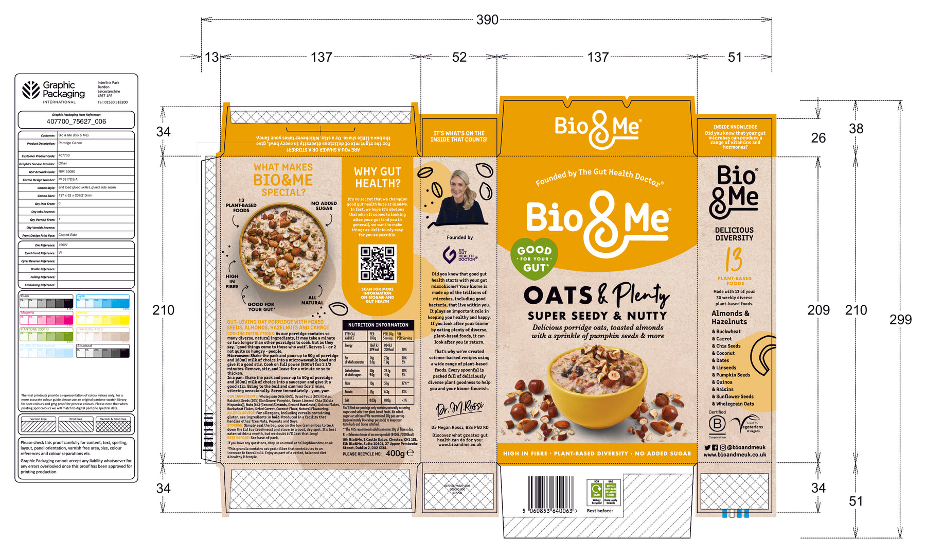 Bio&Me is Co-Founded by Dr Megan Rossi BSc PhD RD, a Registered Dietitian, Nutritionist and research fellow at King's College London. Dr Megan is known as a world-leading gut specialist with a PhD in gut health and has created Bio&Me's range of gut-loving products to make looking after your gut deliciously easy. Packed full of diverse plant goodness, every spoonful helps you and your biome nourish and flourish. Powered by plants, backed by science.