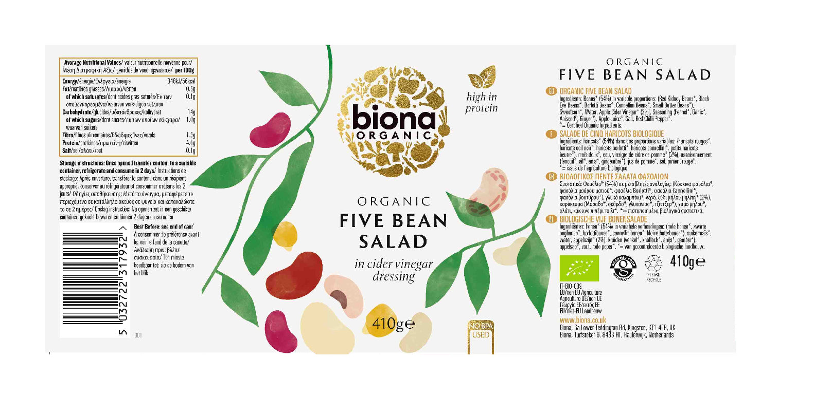 Biona Organic Five Bean Salad mixes a variety of beans including kidney, black eye, borlotti, cannellini and butter beans with sweetcorn in a tangy cider vinegar dressing. This high quality five bean salad is delicious by itself or great as part of a salad.