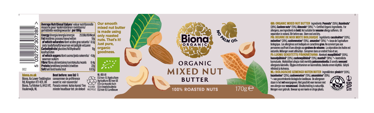 Biona Organic Mixed Nut Butter is milled from small batches of freshly roasted, certified organic nuts. A unique blend of Peanuts, Hazelnuts, Cashew Nuts and Almonds, you can enjoy all the benefits of these nutritious nuts in one sitting. Rich and wholesome in flavour, there is no added sugar or salt and we don't use palm fat or emulsifiers.
