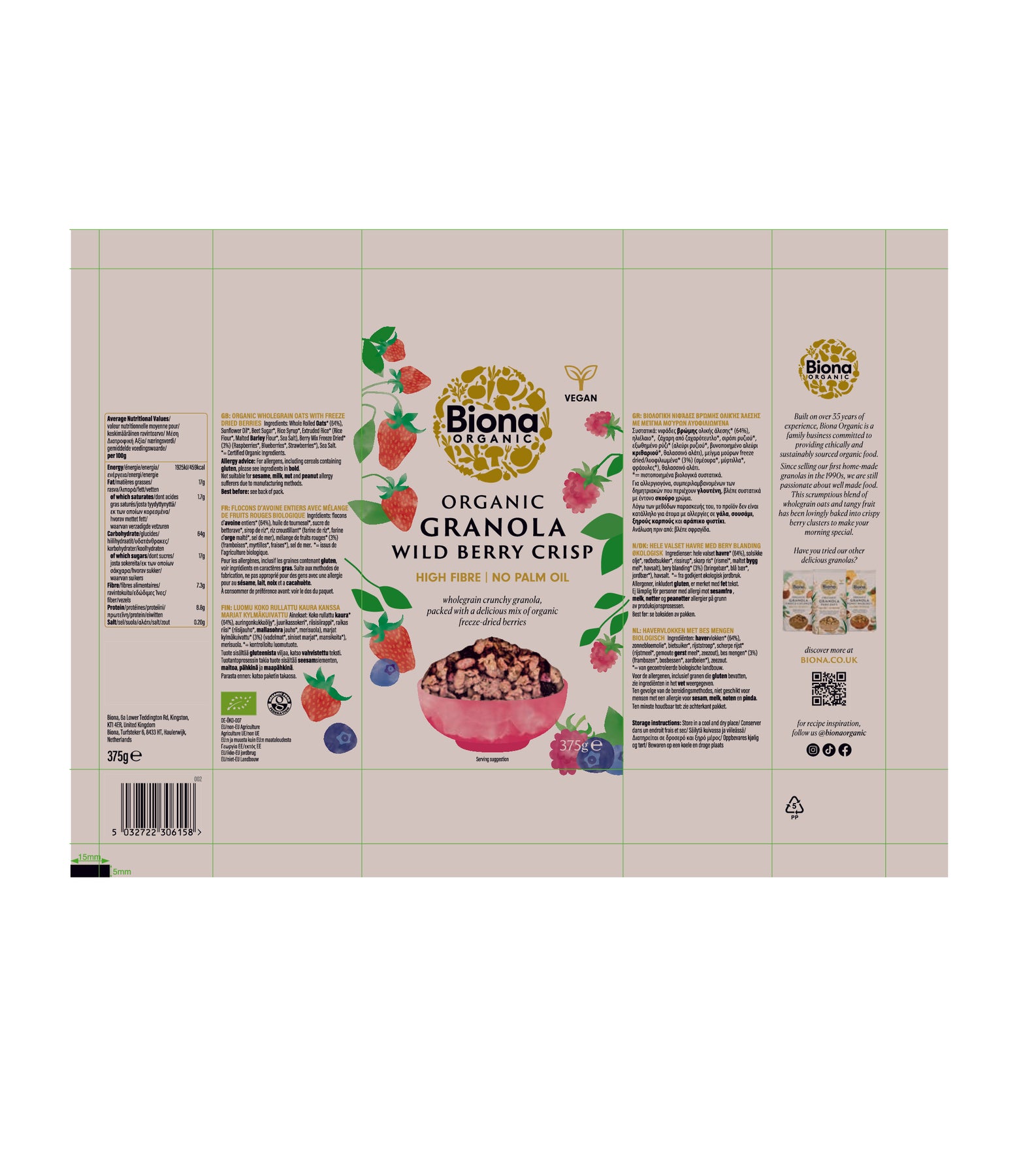 Sumptuous, filling, and temptingly healthy, our Biona Organic Granola with Wild Berries is just the thing to get you out of bed. The goodness of rolled wholegrain oats are combined with a variety of tangy organic berries, and baked into crispy clusters that are as nutritious as they are tasty. High in both fibre and flavour, our organic granola is the perfect way to kick start your day.