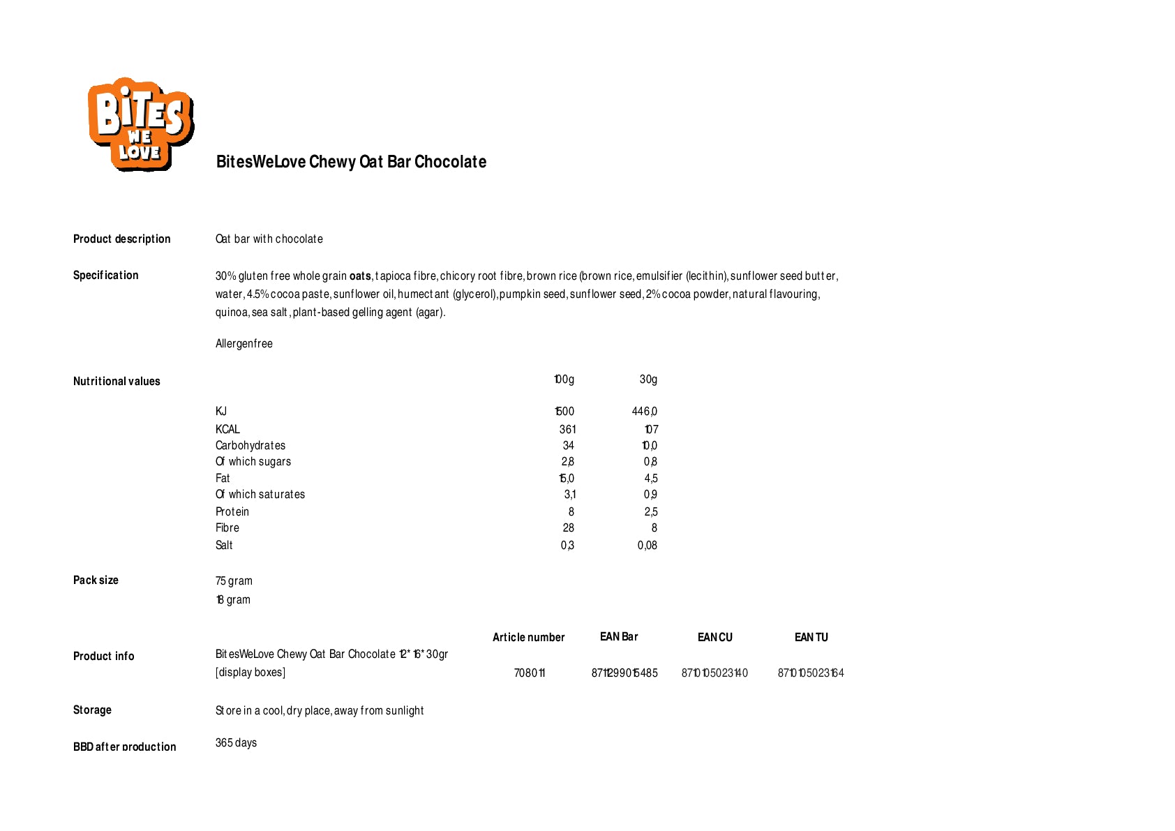 Our Chocolate Chewy Oat Bar is a tasty alternative to sugary snacks, made from whole grain oats, brown rice, tapioca and chicory root fibres, sunflower and pumpkin seeds, quinoa, and sunflower paste. It has 0% added sugar, contains no artificial sweeteners and has a calorie count of just 107kCal per 30g bar. It's also high in fibre and naturally low in sugar (<1g per 30g bar). Perfect for chocolate lovers with cacao paste and cacao powder giving it that delicious flavour.