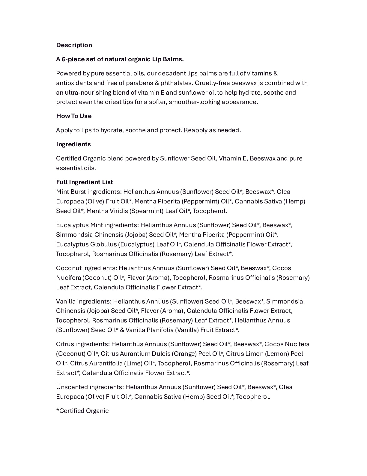 [{"id":42247401701441,"title":"Default Title","option1":"Default Title","option2":null,"option3":null,"sku":"CGC31","requires_shipping":true,"taxable":true,"featured_image":null,"available":true,"name":"Cliganic Organic Lip Balm Set 6pk","public_title":null,"options":["Default Title"],"price":1199,"weight":66,"compare_at_price":null,"inventory_management":"shopify","barcode":"855102007668","requires_selling_plan":false,"selling_plan_allocations":[]}]