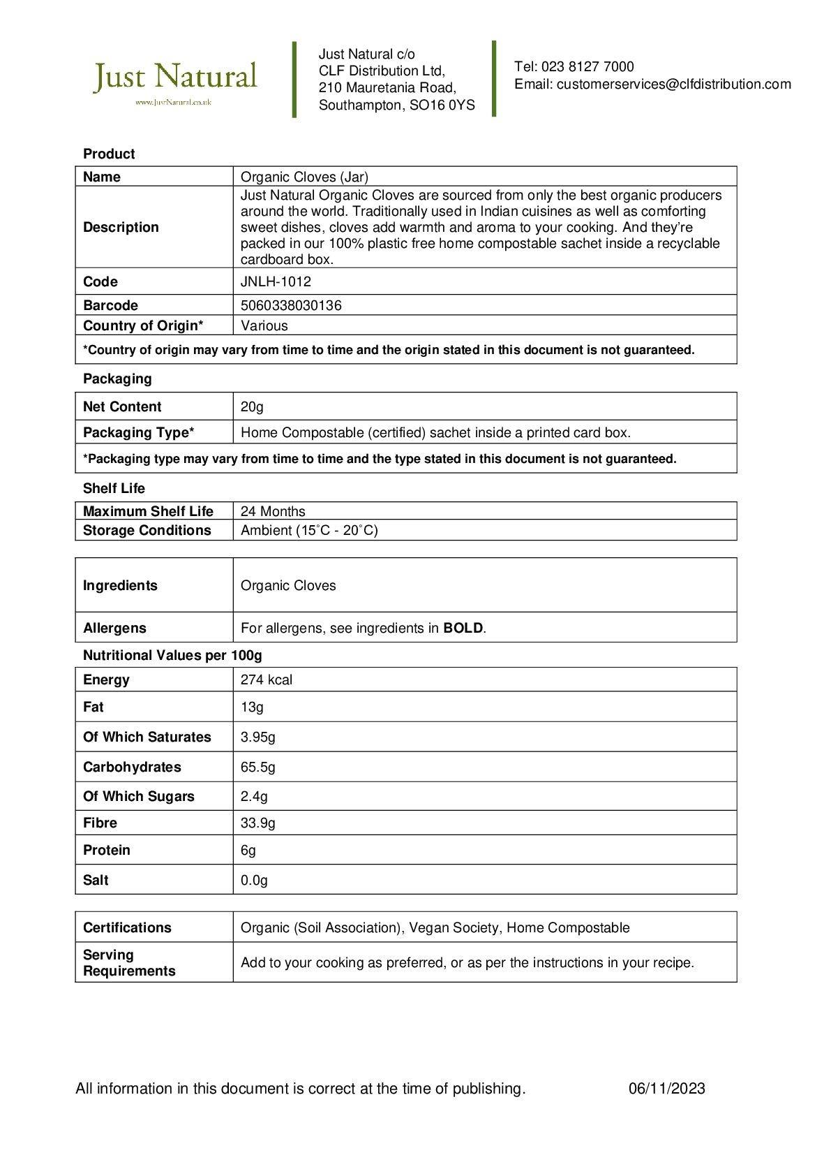 Just Natural Organic Cloves are sourced from only the best organic producers around the world. Traditionally used in Indian cuisines as well as comforting sweet dishes, cloves add warmth and aroma to your cooking. And they're packed in our 100% plastic free home compostable sachet inside a recyclable cardboard box. For nutritional information and ingredients, click Further Information.