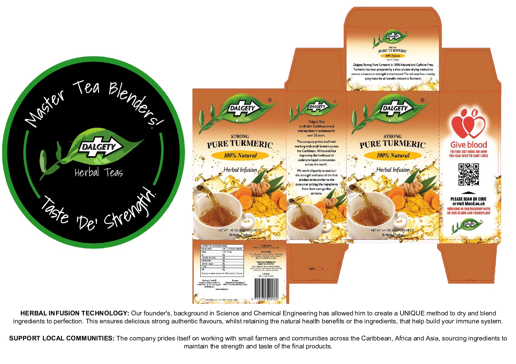 Dalgety Strong Pure Turmeric herbal infusion has a musky, spicy taste. Turmeric tea offers a variety of health benefits, largely due to its active compound, curcumin, which has powerful anti-inflammatory and antioxidant properties. Known to help: reduce inflamation, ease muscle soreness support joint health, boost your immune system and aid digestion.
