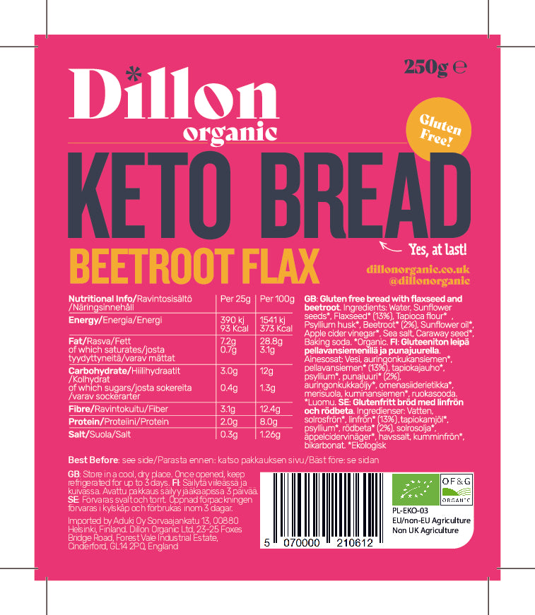 This is our Beetroot Flax Organic Keto bread made with a blend of beetroot, flax, sunflower seeds, and caraway seeds for flavour. It comes as an unsliced half loaf and that gives you the freedom to choose which thickness you'd like to make your slice. Great toasted or double toasted and made into an open sandwich. It is delicious tasting bread that helps keep you fuller for longer, and replaces the need to reach for a high carb loaf with a healthy, keto based alternative.