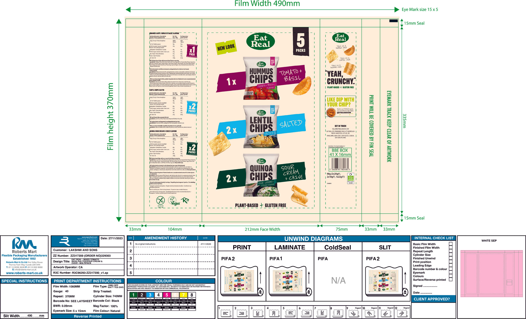 Eat Real Multipack X 5 Lentil Chips Salted 2 X 18g, Quinoa Chips Sour Cream & Chive 2 X 20g, Hummus Chips Tomato & Basil 1 X 22g