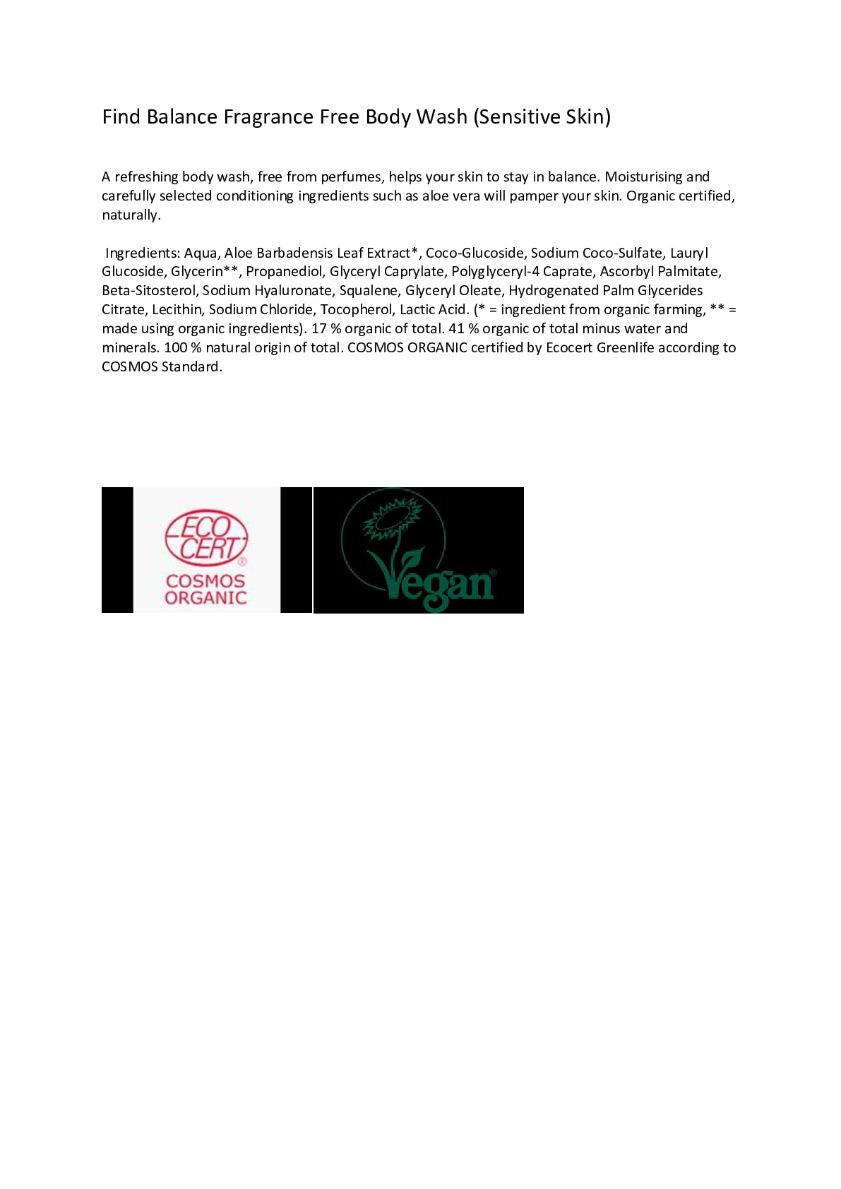 Find Balance Fragrance Free Body Wash (Sensitive Skin) 500mlA refreshing body wash, free from perfumes, helps your skin to stay in balance. Moisturising and carefully selected conditioning ingredients such as aloe vera will pamper your skin. Organic certified, naturally.