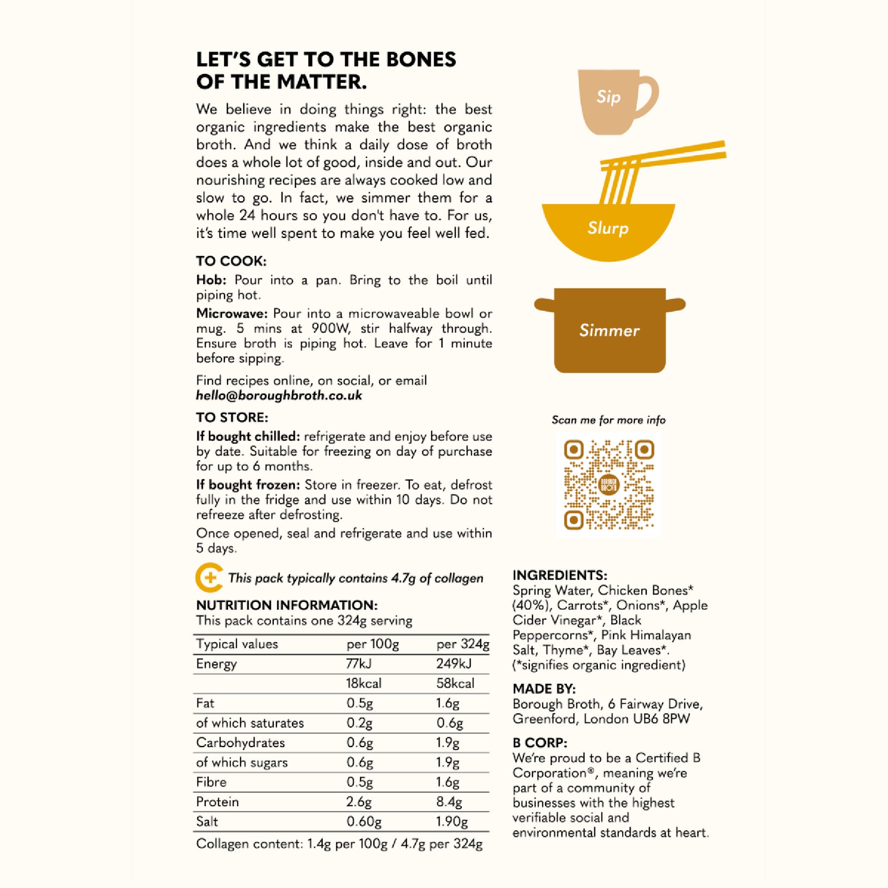 Made using free-range, 100% organic British Chicken bones, this two-star Great Taste Award-winning broth is a firm customer favourite. Simmered for 24-hours, it's densely packed with 40% bones, guaranteeing a deeply rich, comforting umami hit in every single batch. Beautifully versatile, it's perfect for a hearty mug of broth or to use in your home cooking. Try in a bowl of ramen, rich gravy or to give delicious depth to sauces.