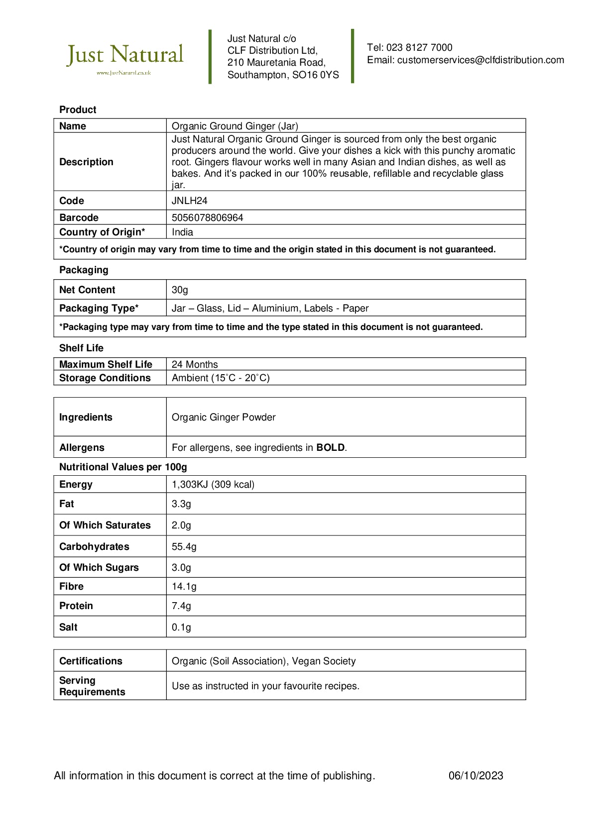 Just Natural Organic Ground Ginger is sourced from only the best organic producers around the world. Give your dishes a kick with this punchy aromatic root. Gingers flavour works well in many Asian and Indian dishes, as well as bakes. And it's packed in our 100% reusable, refillable and recyclable glass jar. For nutritional information and ingredients, click Further Information.
