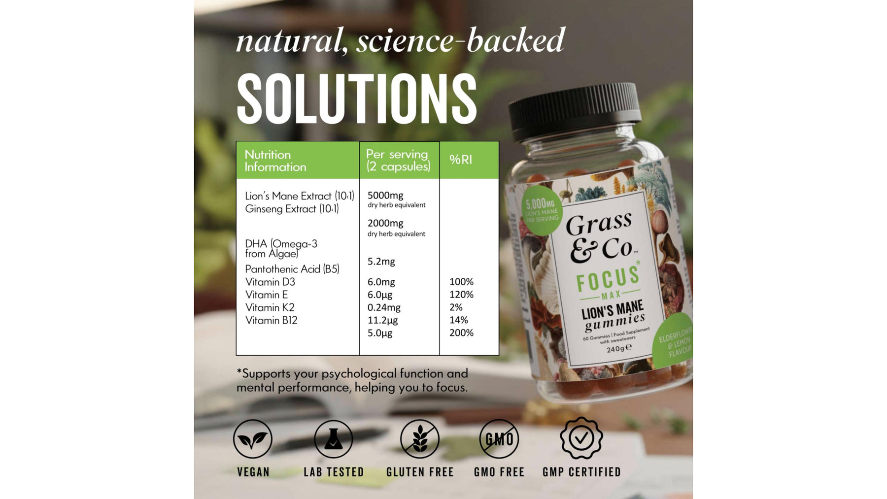 These are more than just delicious Elderflower and Lemon flavoured gummies! Each of these vegan Mushrooms Gummies delivers 5000mg of the full spectrum of the mushrooms' fruiting bodies and are rich in active compounds including beta-D-glucan polysaccharides and triterpenoids.