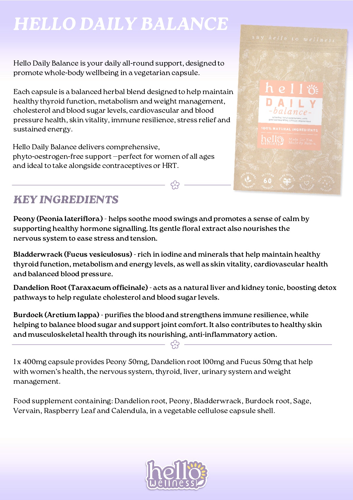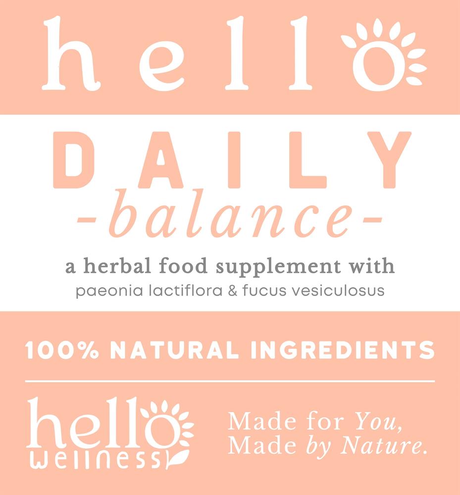 Hello Daily Balance is a herbal blend designed to help maintain healthy metabolism and weight management, blood sugar and energy levels, cardiovascular and immune resilience all in one capsule. With bladderwrack for metabolism and cardio support, dandelion for the liver and kidneys, burdock supporting joints, immunity and blood sugars, as well as peony for the nervous system, Hello Daily Balance delivers phyto-oestrogen-free support -perfect for women of all ages.