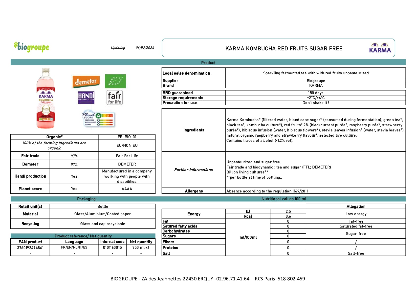 Karma Kombucha Zero Sugar Red Fruits 75CL is a fermented tea, full of probiotics, low in calories (11Kcal/100ml). It's Organic, Fair For Life and Carbon Compensated. This supersize is great for Kombucha fans that wish to have a great price per value and enjoy sugar free kombucha anytime of the day.