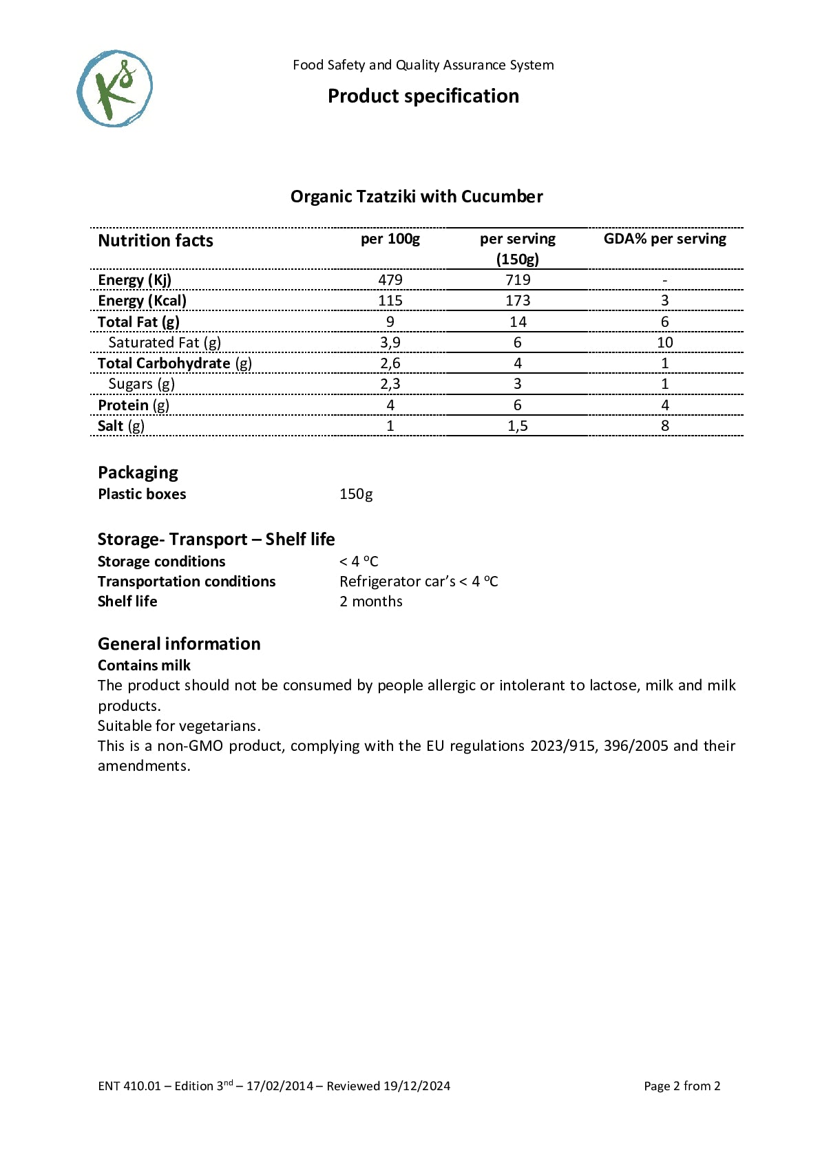 Organic Tzatziki is perfect as an appetizer and it can be served with any snack or meal.