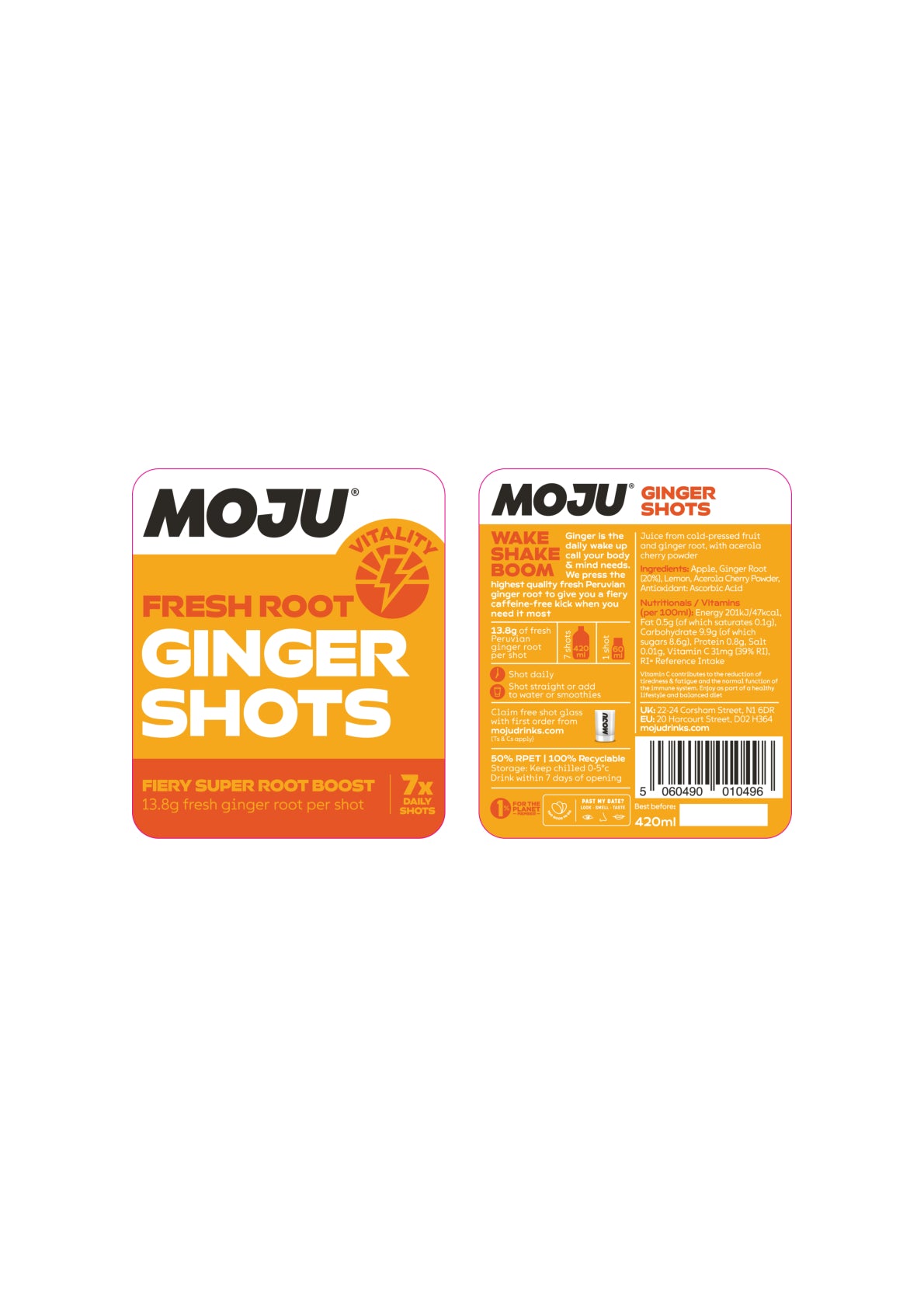 WAKE SHAKE BOOM Ginger is the daily wake up call your body and mind needs. MOJU press the highest quality fresh Peruvian ginger root to give you a fiery caffeine-free kick when you need it most. - 7 x Daily Shots in Every Bottle - Shot daily - Shot straight or add to water or smoothies