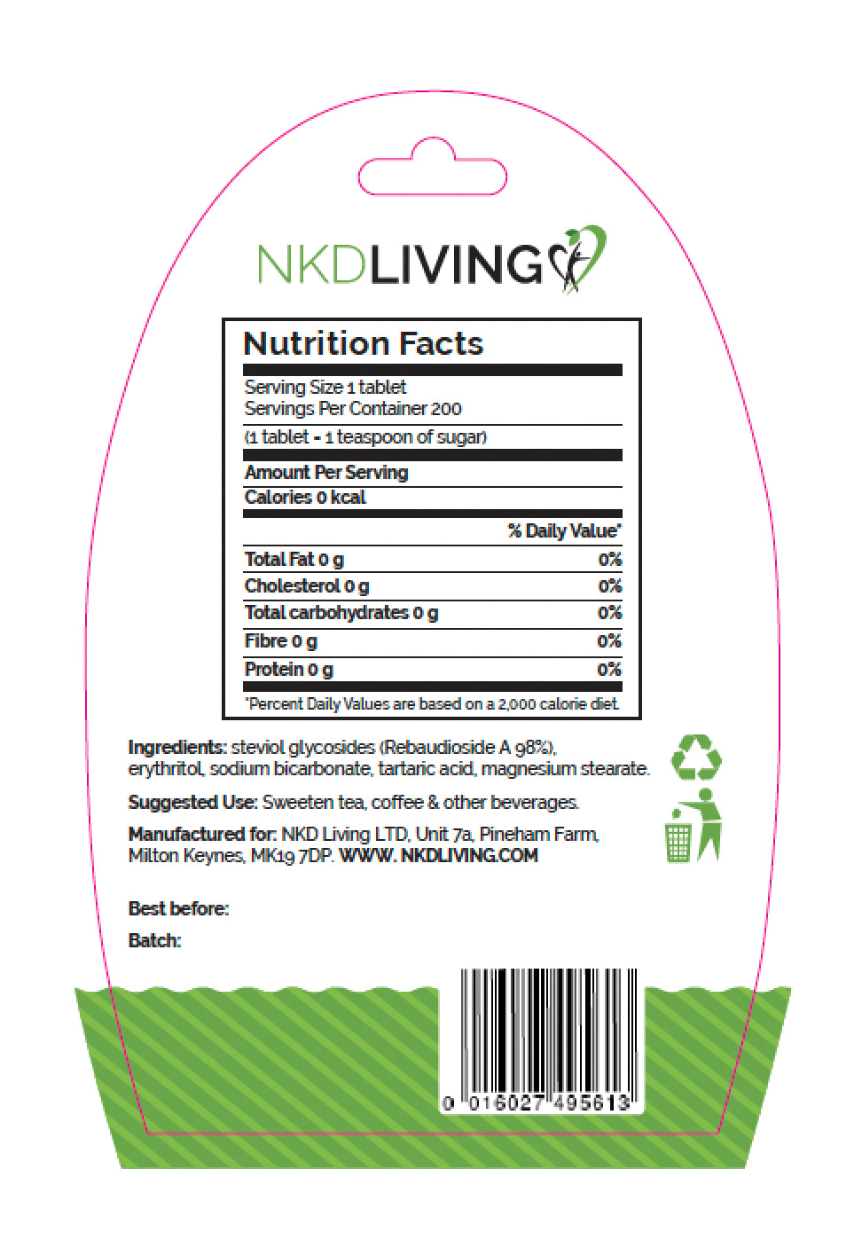 NKD Living's stevia tablets are made from only the best tasting least bitter extract of the stevia leaf (Rebaudioside A at 98% purity) is used, giving it a dynamic sweetness without the bitterness associated with other stevia products. It is then combined with the natural sweetener erythritol which acts as a bulking agent and sodium bicarbonate which makes the tablets dissolve very easily in hot drinks. 200 pure Stevia Tablets are provided in a compact, pocket-size dispenser for convenience. Each tablet dissolves instantly in your hot drink, adding the perfect sweetness with no calories! Next time someone asks if you want sugar in your tea, you just tell 'em no thanks, you're sweet enough!