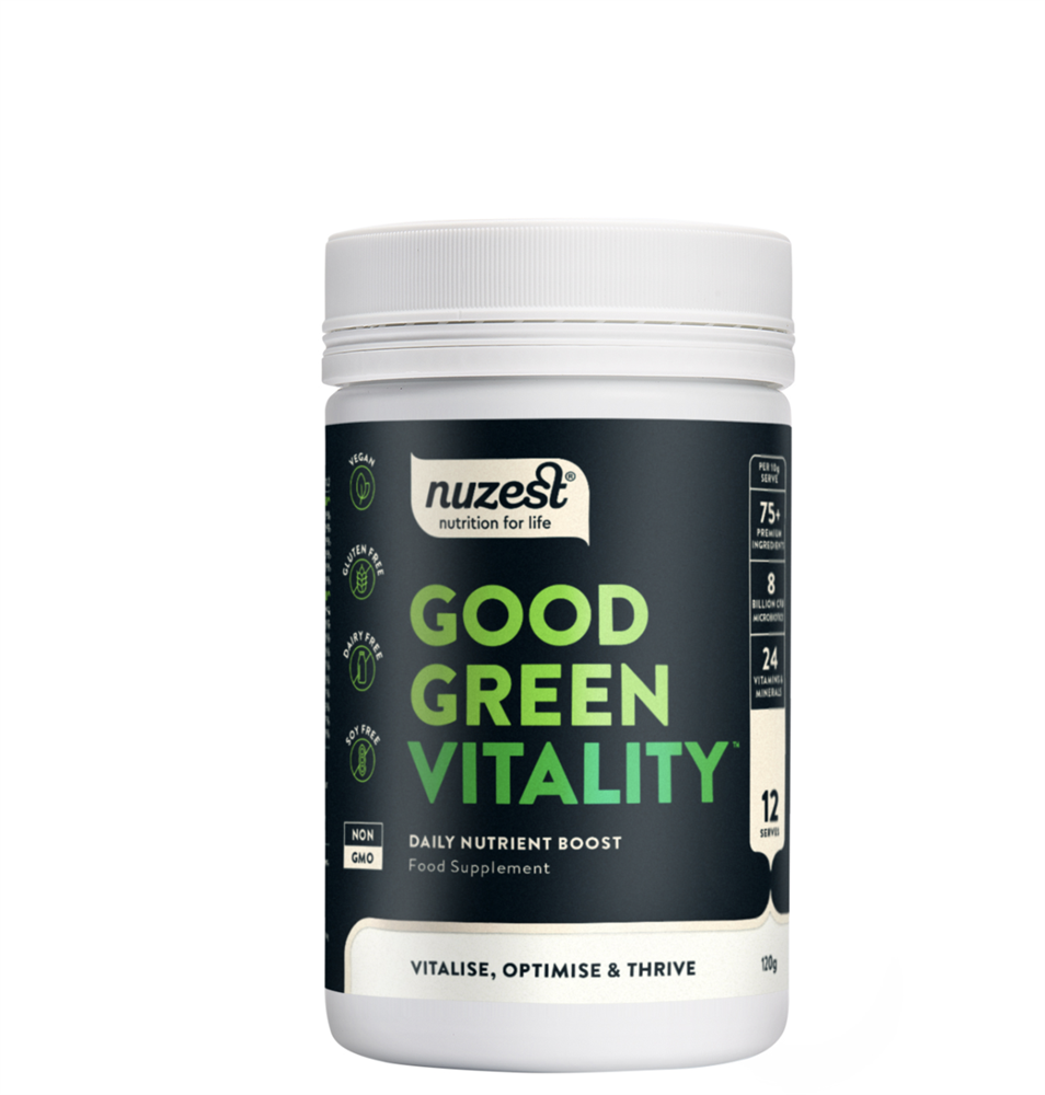Fill in the (nutrient) blanks with Good Green Vitality. This nutritional superblend is carefully formulated to address all aspects of health. The synergistic effect of over 75 ingredients supports all of your body systems from digestion and immunity, to healthy ageing, stress management, energy, and cognition with one daily serve. Bottoms up.