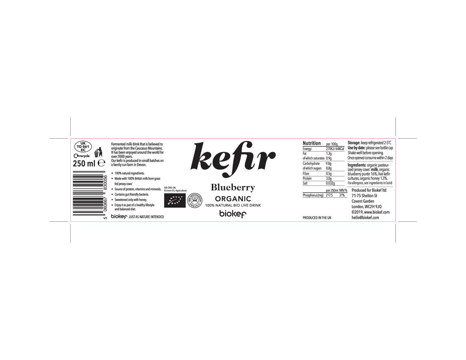 Delicious and nutritious natural kefir with a puree of real blueberries and dash of honey to add a little sweetness.