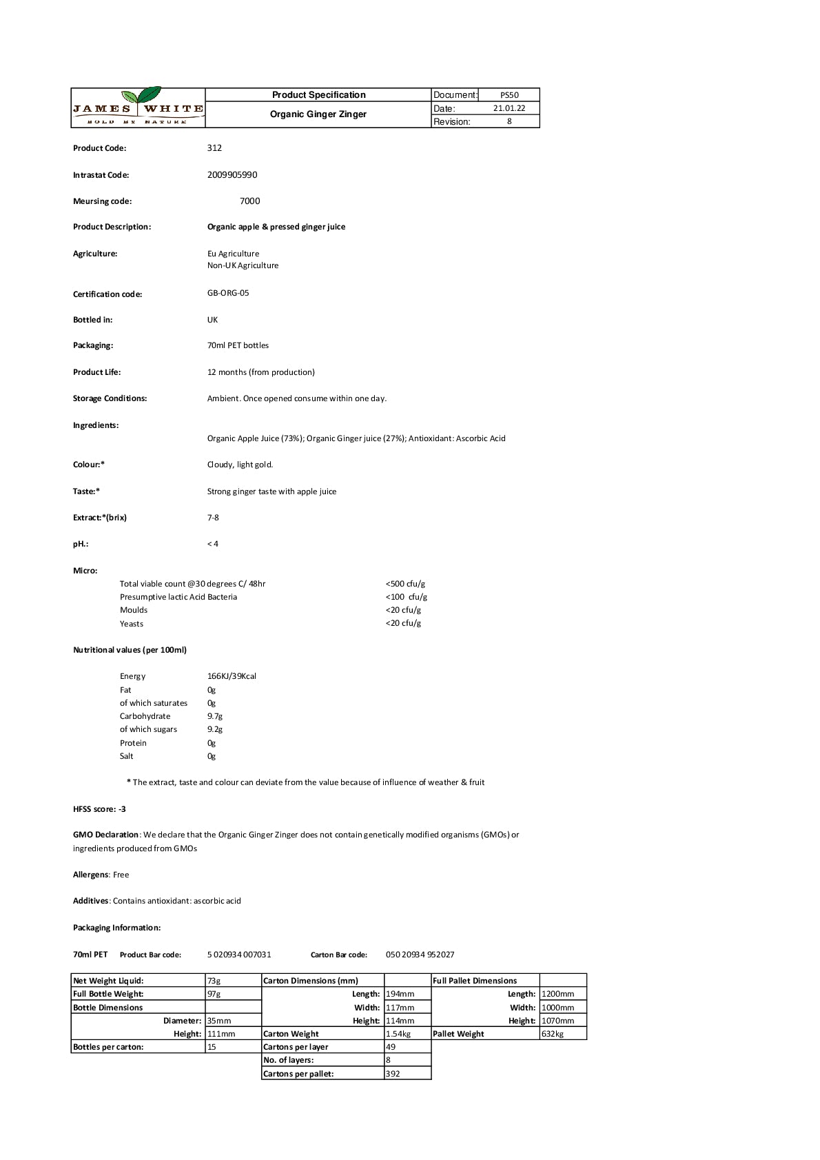 Organic Ginger Zinger Shot 70ml (Sold in multiple of 5)