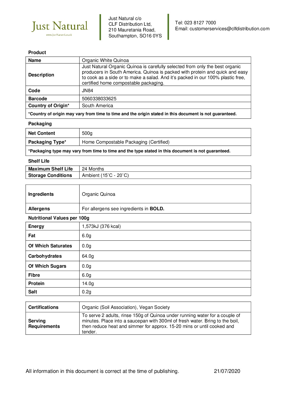 Just Natural Organic Quinoa is carefully selected from only the best organic producers in South America. Quinoa is packed with protein and quick and easy to cook as a side or to make a salad. And it's packed in our 100% plastic free, certified home compostable packaging. For nutritional information and ingredients, click Further Information.