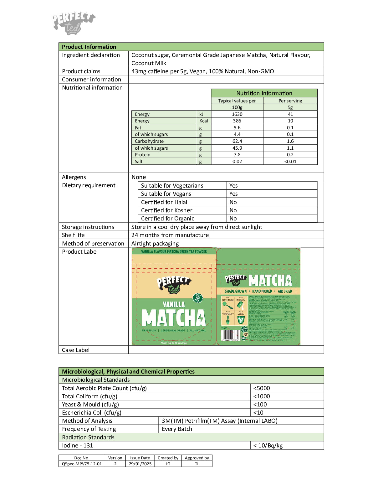 Vanilla flavour matcha green tea powder. Shade-grown, hand-picked, air-dried, stone-ground, ceremonial grade, non-GMO matcha. Matcha is a finely ground green tea powder celebrated for its vibrant colour, smooth taste, and powerful health benefits. Matcha delivers a concentrated dose of antioxidants and nutrients, while providing calm, sustained energy, thanks to a unique combination of caffeine and L-theanine.