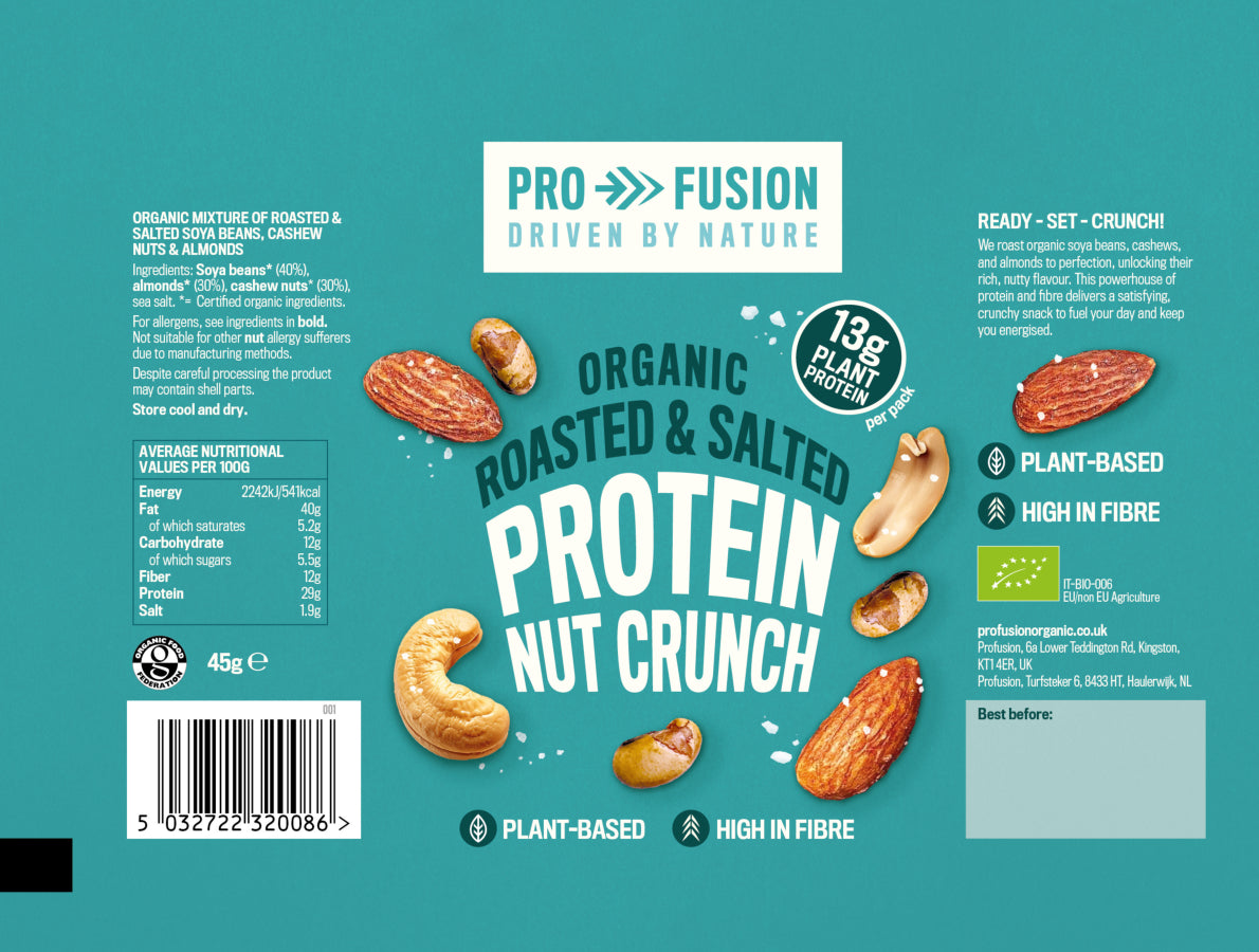 Profusion's Organic Roasted & Salted Protein Nut Crunch is a powerhouse blend of organic soybeans, cashews, and almonds-packed with protein and nutrients.