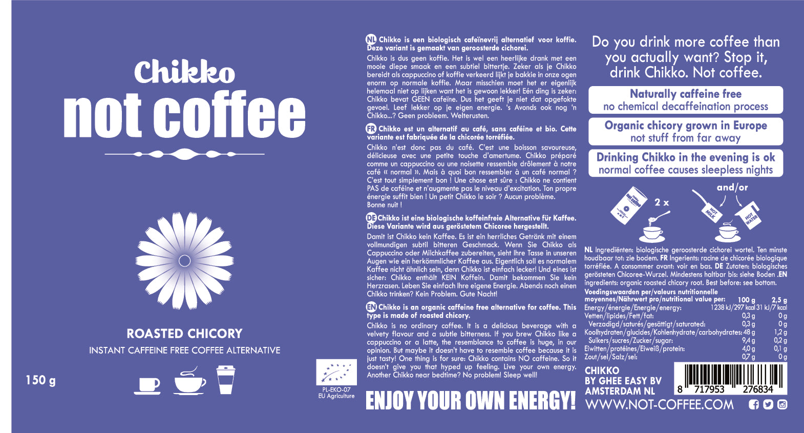 Chikko is an organic caffeine-free alternative for coffee made from roasted chicory. Chikko is no ordinary coffee. It is a delicious beverage with a velvety flavour and a subtle bitterness. If you brew Chikko like a cappuccino or a latte, the resemblance to coffee is huge, in our opinion. But maybe it doesn't have to resemble coffee because it is just tasty!