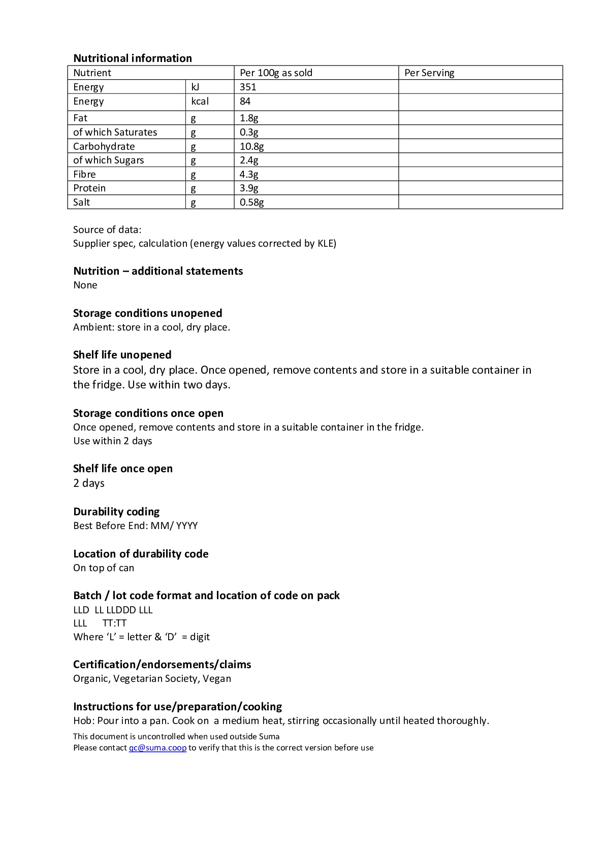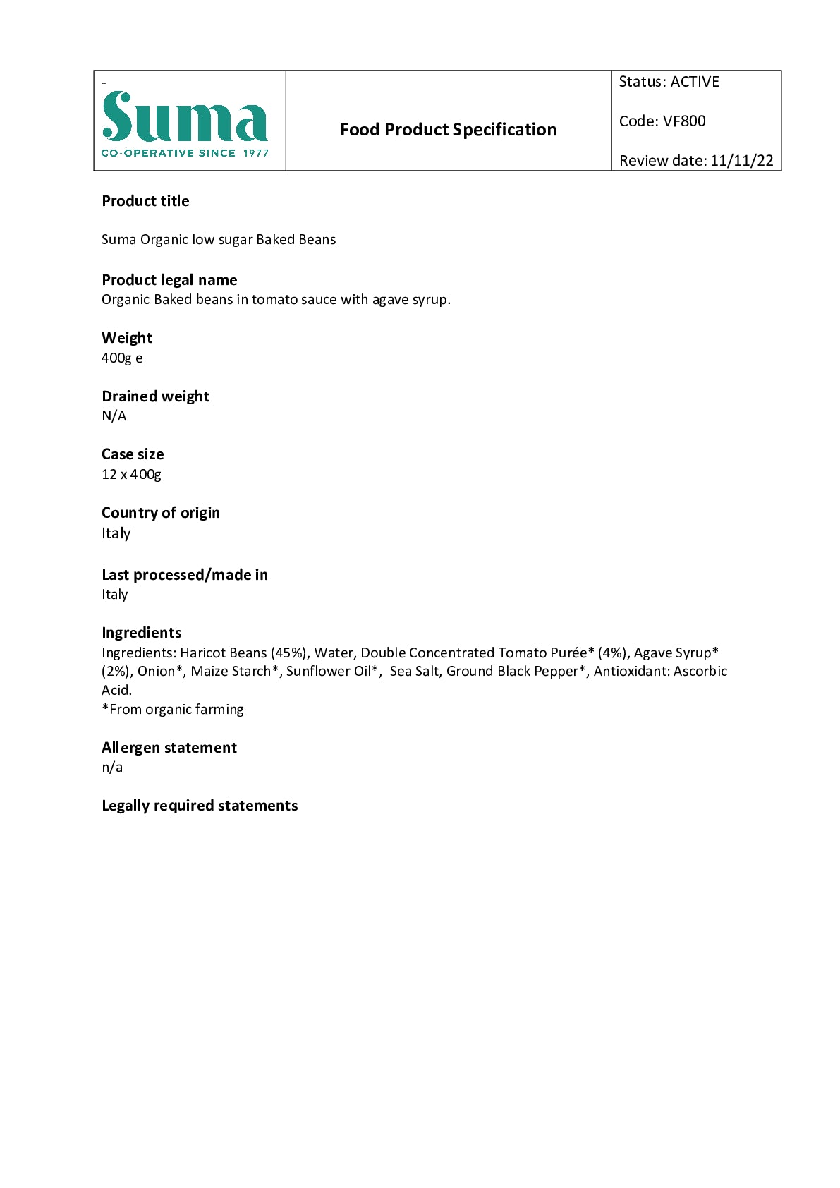 Suma low sugar baked beans are made in Italy using organic haricot beans and organic Italian tomato. We've added the natural sweetness from agave syrup to create a reduced sugar version to sit alongside our other popular baked beans.