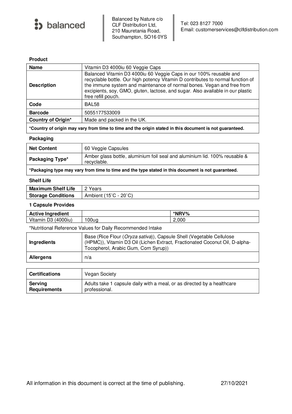 Balanced Vitamin D3 4000iu 60 Veggie Caps in our 100% reusable and recyclable bottle. Our high potency Vitamin D contributes to normal function of the immune system and maintenance of normal bones. Vegan and free from excipients, soy, GMO, gluten, lactose and sugar. For nutritional information and ingredients, click Further Information.